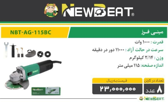 این محصول نیو بیت دارای موتوری قدرتمند با توان 1100وات با سرعت چرخش 11000 دور در دقیقه و سایز صفحه 115 میلی متر می باشد..این دستگاه دارای قفل اسپیندل می باشد .همچنین در برابر گرد و غبار نیز مقاوم می باشد و مجهز به سیستم خنک کننده می باشد که این قابلیت ها باعث افزایش طول عمر دستگاه می شوند.طراحی باریک بدنه این دستگاه، امکان گرفتن آنرا به کمک یک دست فراهم میکند.